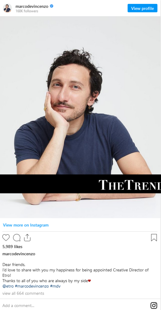 Marco De Vincenzo is the new Creative Director of Etro. He will be in control of the menswear, womenswear, and home, showcasing his first collection debuting at Milan Fashion Week in September. He replaces the longstanding Creative Directors, Veronica and Kean Etro. The Etro family sold the business to a private equity firm, L. Catterton. De Vincenzo shared the news on his Instagram. “I’d love to share with you my happiness for being appointed creative director of Etro! Thanks to all of you who are always by my side,” he wrote.